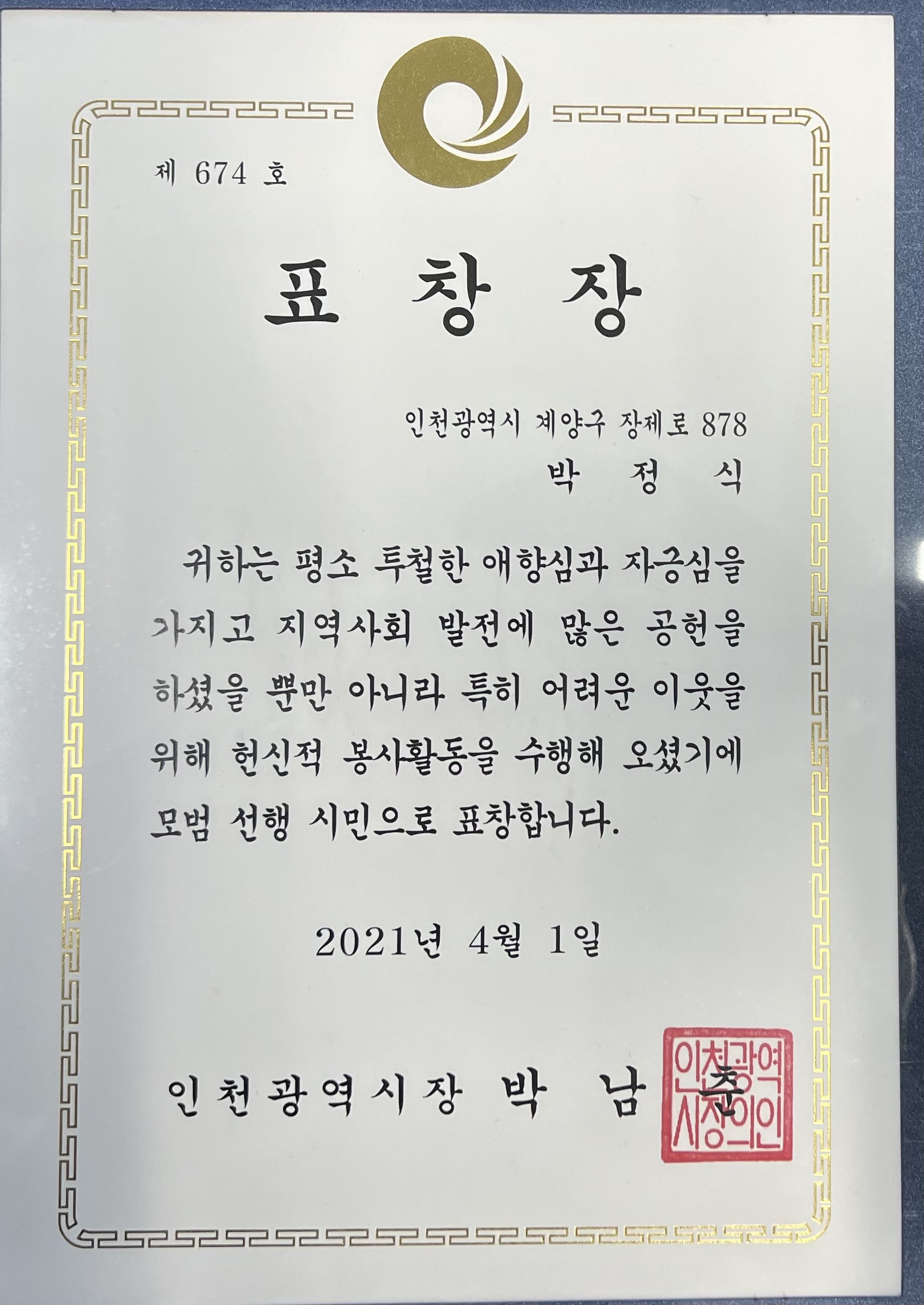 제674호 인천광역시장 표창장 수상 작성일2023-04-05 16:32:49 | 관리자 | 조회 206회 본문 댓글목록 × 댓글수정 - 패스워드확인 확인 닫기 × 댓글수정 확인 닫기 × 댓글삭제 - 패스워드확인 확인 닫기